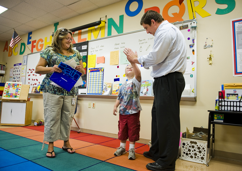 - Caption: Kindergartener Hyde Whitmer, 5, (center) high fives his dad, Robert Whitmer (right), on the first day of school while teacher Beth Hagan (left) looks on at Fuentes Elementary School in Kyle on Mon., Aug. 27, 2012. Ashley Landis FOR AMERICAN STATESMAN