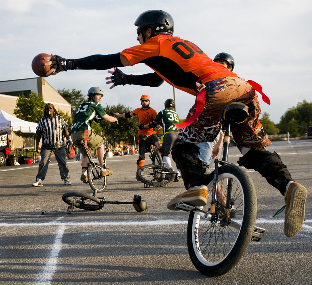 - Caption: Unicychos' Alan "Corporal Punishment" Barnes reaches to catch a pass in the end zone during the Gnarwhals v. Unicychos unicycle football match up on Sun., Nov. 11, 2012 at the San Marcos Activity Center. Photo by Ashley Landis