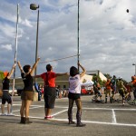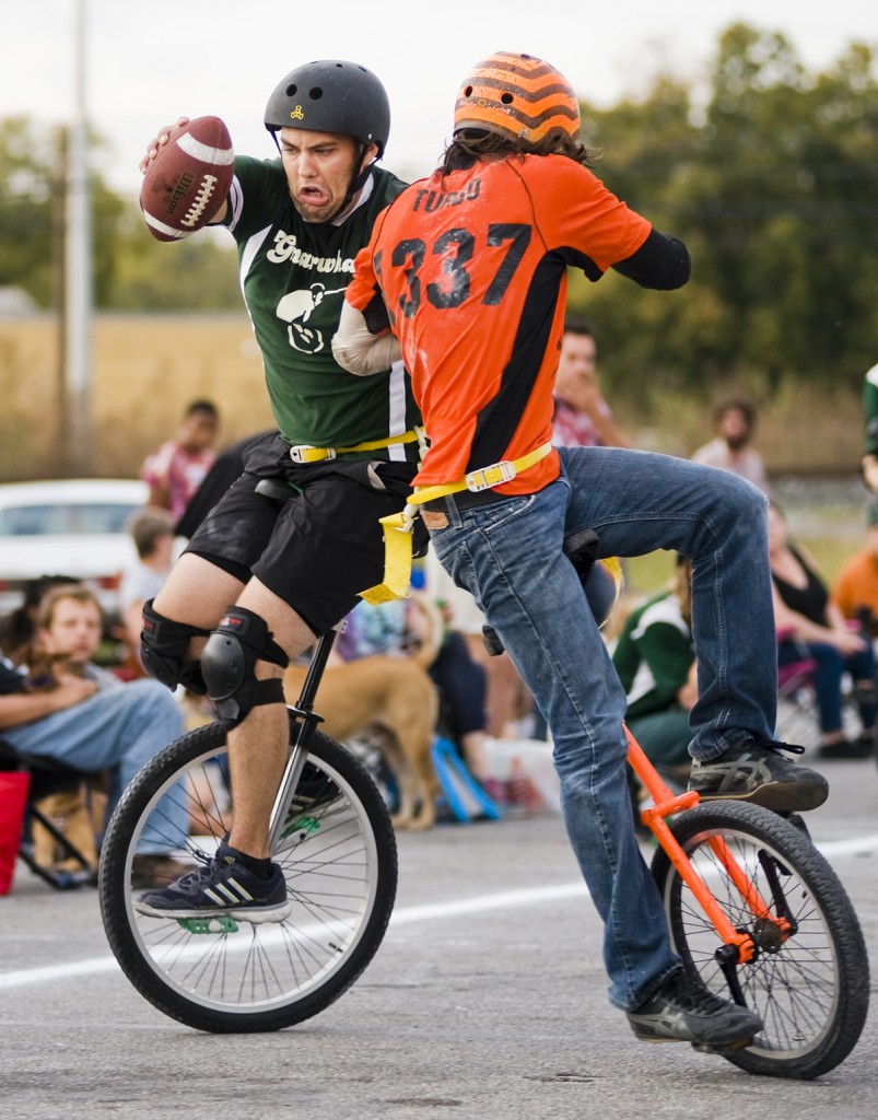 - Caption: Gnarwhals' quarterback "Dr. RockDaPus", left, is tackled by Unicychos' Michael "Turbo" Rowe, right, during the Gnarwhals v. Unicychos unicycle football match up on Sun., Nov. 11, 2012 at the San Marcos Activity Center. Photo by Ashley Landis