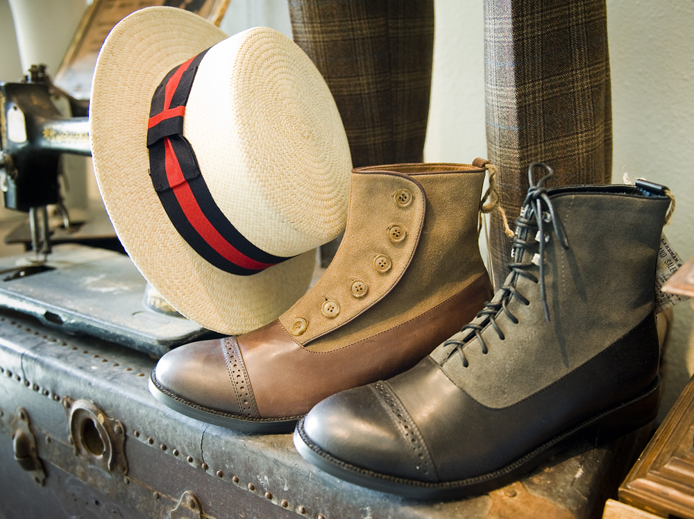 A skimmer hat, left, “The Christophe” spat boots, center, and “The Clem” lace-up boots, right, at Dandy’s, a store that features men’s clothing and accessories from and inspired by the 1870s – 1930s. Dandy’s owners Wendy and Christopher Bykowski designed the boots. Dandy’s is located inside Filin on South Lamar Blvd.