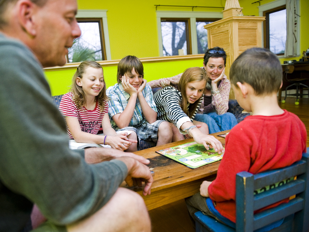 From left, Kenny Anderson, Esme Anderson, 10, Otto Anderson, 13, Lucy Anderson, 15, author Bernadette Noll and Dean Anderson, 6, play a game together at their south Austin home on Thurs., March 28, 2013.
