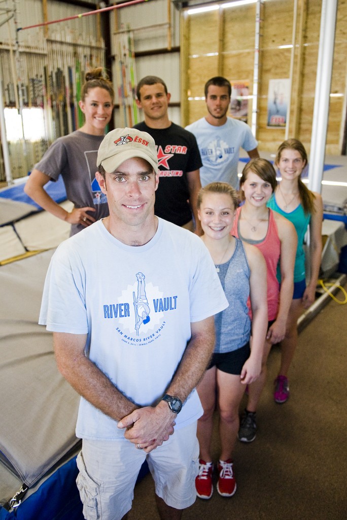- Caption: Pole vaulting head coach Kris Allison, front, with three of his current students (bottom row from left to right), Meagan Gray, 15 of Hays High School, Nicole Summersett, 16, of Westlake High School and Kally Long, 17, of Wimberley High School, and three of his coaches and former students (top row from left to right) Jessica Blair, Will Kirchhoff and Jonathan Johnson at Lone Star Pole Vault in New Braunfels on Tues., May 7, 2013. Ashley Landis for American-Statesman