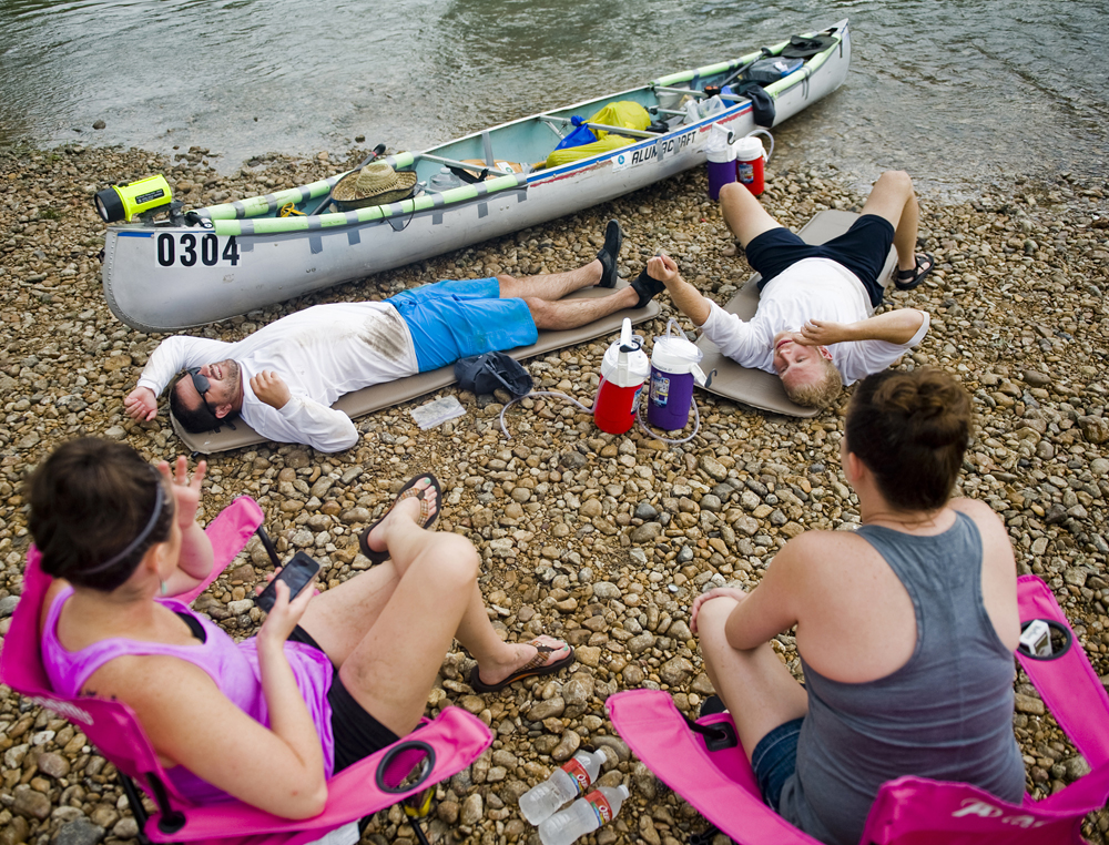Novice Paddlers Dusty Coates, top left, and Alan Whited, top right, rest at the the Gonzales 183 checkpoint in Gonzales, TX with their team captain, Aubrey Coates, bottom left, and Cheri Conlin, bottom right, during the 2013 Texas Water Safari on Sun., June 10, 2013. The Texas Water Safari is an annual 260-mile canoe and kayak race that begins in San Marcos, TX at Aquarena Springs, travels down the San Marcos River and Guadalupe River to the San Antonio Bay, ending in Seadrift, TX. Over 100 teams had four days to complete the race, which is billed as the World’s Toughest Canoe Race.