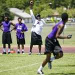 LBJ High School cornerback and wide receiver Zae Giles, 16, (11) relaxes on new turf while his team mates watch 2012 game highlights in a newly revamped varsity locker room on Mon., Aug. 5, 2013 at LBJ High School. The booster club took donations to provide a television, sound system, new benches, turf and other amenities.