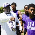The LBJ High School football team practices with head coach Andrew Jackson, center, who was most recently the offensive coordinator for Manor High School, on Mon., Aug. 5, 2013 at LBJ High School.