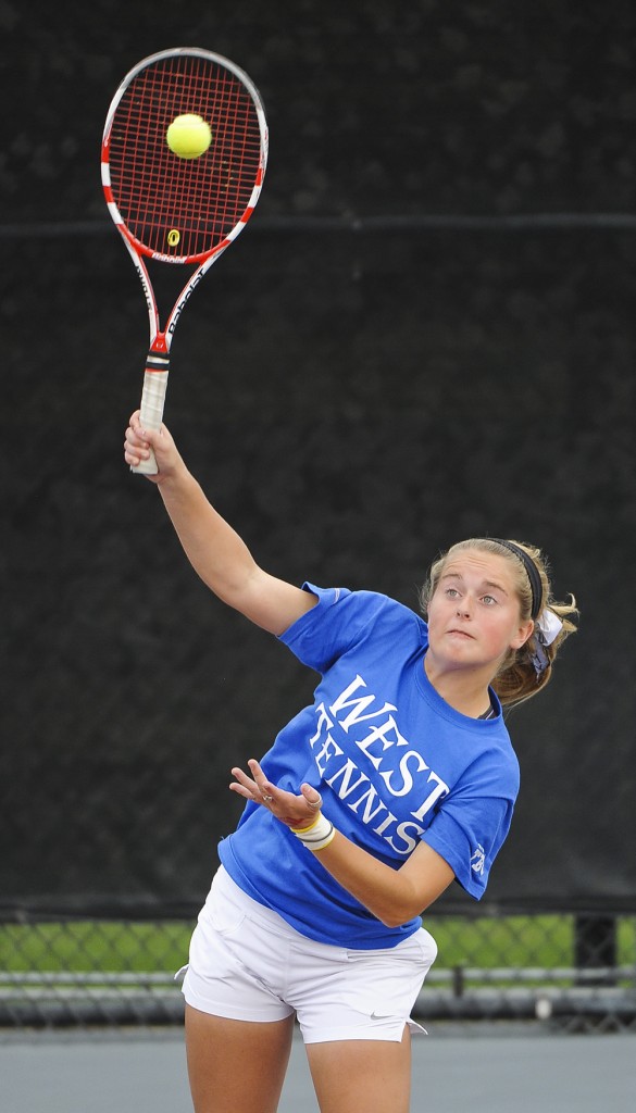 Plano West’s Emily Houston during a girls doubles match with partner Seema Prakash the UIL Class 5A team tennis state semifinal between Plano West and New Braunfels High School on Mon., Nov. 4, 2013 at the Mitchell Tennis Center at Texas A&M Univ. in College Station, TX.