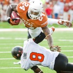 Texas’ Kendall Sanders (2) is tackled by OSU’s Caleb Lavey (45) during the University of Texas v. Oklahoma State University football game on Sat., Nov. 16, 2013 at Darrell K. Royal Memorial Stadium.