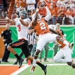 Texas’ Mykkele Thompson (2) and Duke Thomas (21) celebrate an interception during the University of Texas v. Oklahoma State University football game on Sat., Nov. 16, 2013 at Darrell K. Royal Memorial Stadium.