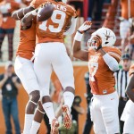 Longhorn defensive back coach Duane Akina, right, hugs Mykkele Thompson (2) after an interception during the University of Texas v. Oklahoma State University football game on Sat., Nov. 16, 2013 at Darrell K. Royal Memorial Stadium.