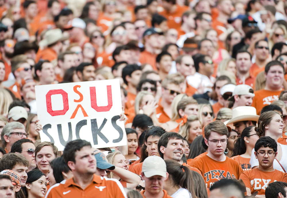 Longhorn fans hold up a sign in the stands during the University of Texas v. Oklahoma State University football game on Sat., Nov. 16, 2013 at Darrell K. Royal Memorial Stadium.