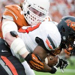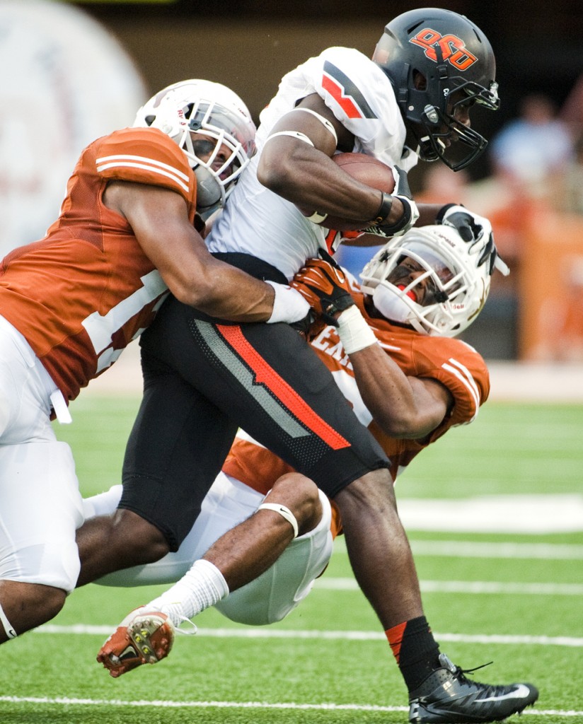 - Caption: OSU's Jhajuan Seales (81) is tackled by Texas' Adrian Phillips (17) and Carrington Byndom (23) during the University of Texas v. Oklahoma State University football game on Sat., Nov. 16, 2013 at Darrell K. Royal Memorial Stadium. Ashley Landis for American-Statesman