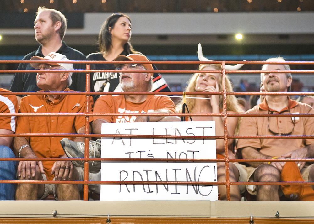 - Caption: Disappointed Texas fans sit behind a sign that says, "at least it's not raining" during a 38-13 loss to Oklahoma State University football game on Sat., Nov. 16, 2013 at Darrell K. Royal Memorial Stadium. Ashley Landis for American-Statesman