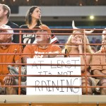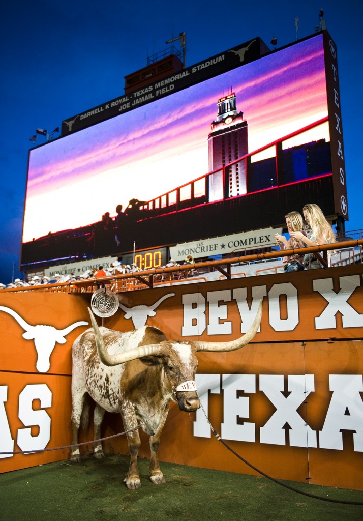 - Caption: Bevo stands under the sunset displayed on the jumbotron after the University of Texas v. Oklahoma State University football game on Sat., Nov. 16, 2013 at Darrell K. Royal Memorial Stadium. Ashley Landis for American-Statesman