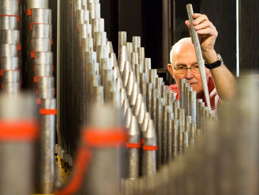 Dan Abrahamson of Contemporary and Classic Church Organs in Kansas City, Mo. tweeks a small pipe while installing a refurbished pipe organ at the new St. Mark’s Episcopal Church. Abrahmson, Dave Cording and Stephen Wittman have spent countless hours restoring a 40-year-old pipe organ for the new sanctuary, which will have its grand opening on Feb. 14.