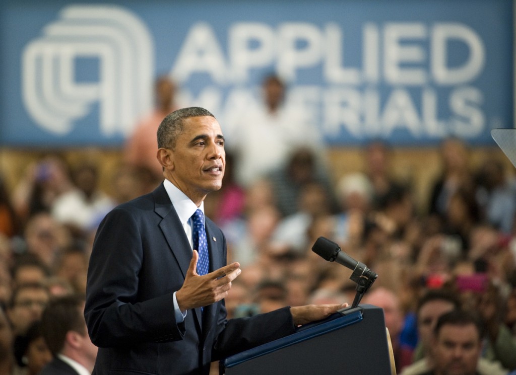 The setup at Applied Materials was very similar to Manor New Tech – a set of risers in the back, facing Obama, and a set of risers on the side. I liked this location a little better because there was more room to move around on the risers, there were more people in the crowd and the light wasn’t so dramatic.