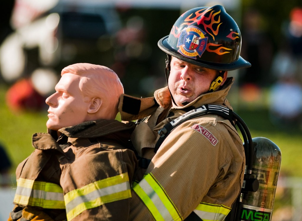 And finally, they drag a 165 pound Rescue Randy mannequin backwards 75 feet to the finish line. (Shown at the top)